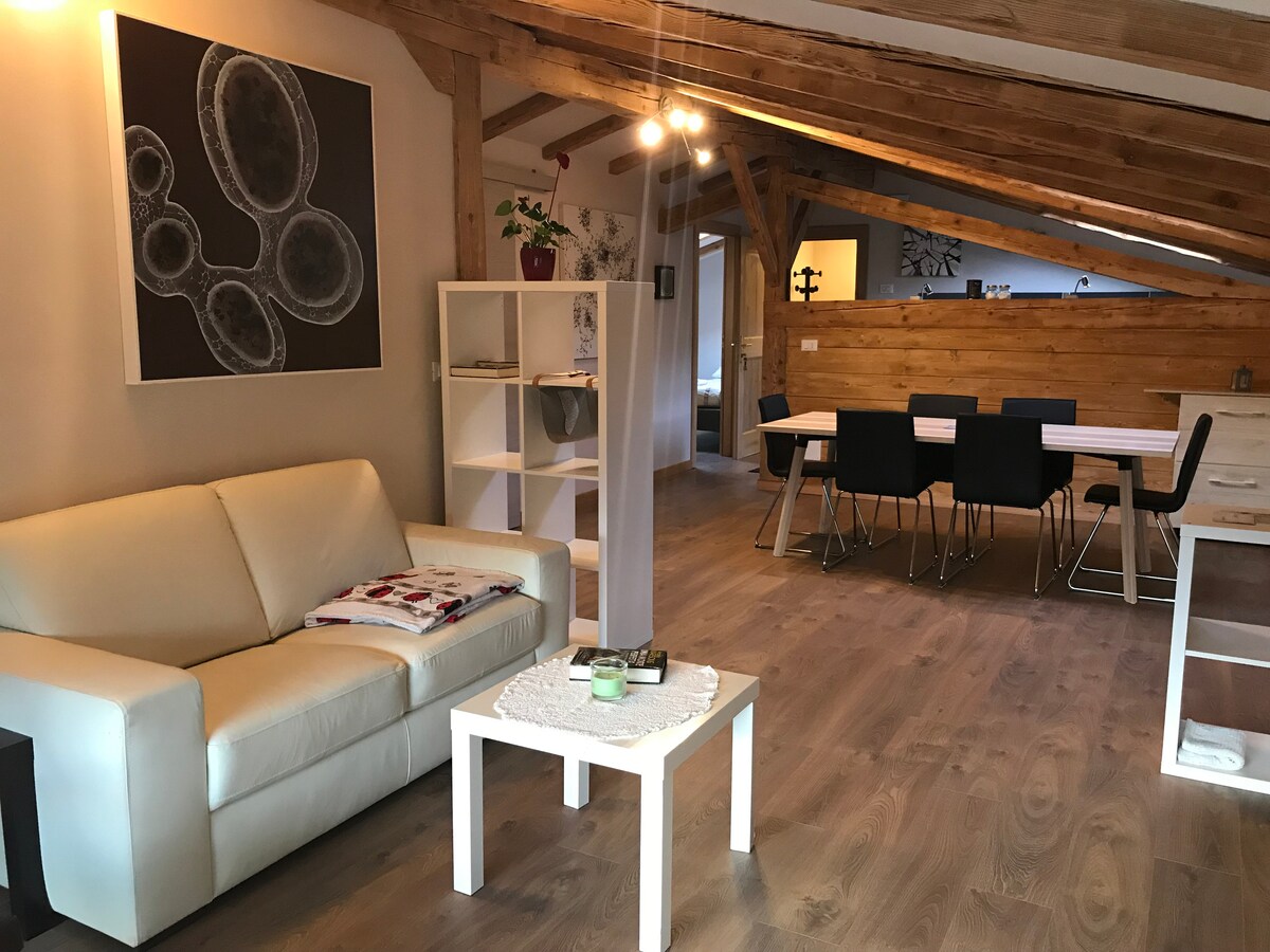 La mansarda si compone di camera matrimoniale con possibilità di terzo letto,bagno,angolo cottura,salone con divano letto doppio ,terrazzo e parcheggio. Rivestimento pareti e arredamento in legno di abete. Ristrutturazione completa terminata a luglio 2020.