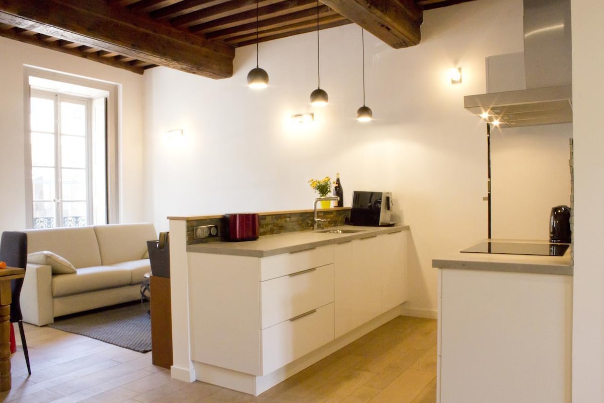 歴史的中心部に位置し、ボーヌのホスピスにも近い。歴史的モニュメントに登録された15世紀の古い邸宅の2階に位置するこの快適で全面改装されたアパートメントは、2名様でご利用いただけます。 設備の整ったキッチンに向かう大きなリビングルーム、トイレ付きシャワールーム、クイーンサイズのベッドを備えた寝室で構成されています...高速インターネット、Wi - Fi、大きなテレビ画面、バスアメニティ、コーヒー、お茶...