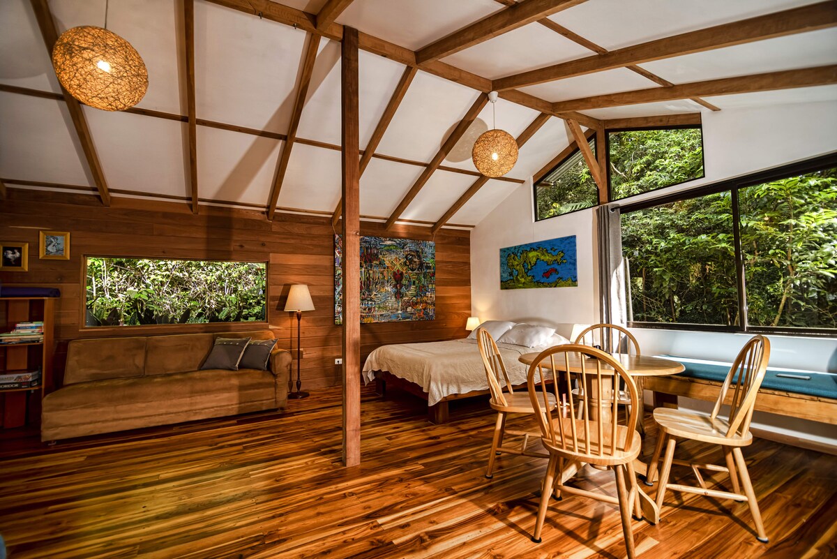 Welcome to NATURAVE, your treetop retreat in the heart of Monteverde. Surrounded by the cloud forest, our cozy cabin invites you to wake to birdsong, sip fresh coffee, and unwind in nature’s tranquility. Enjoy a terrace with hammock and coffee station, a full bathroom, and a charming loft bedroom under a wooden dome with mountain views. Check-in: 2:00 pm Check-out: 10:00 am