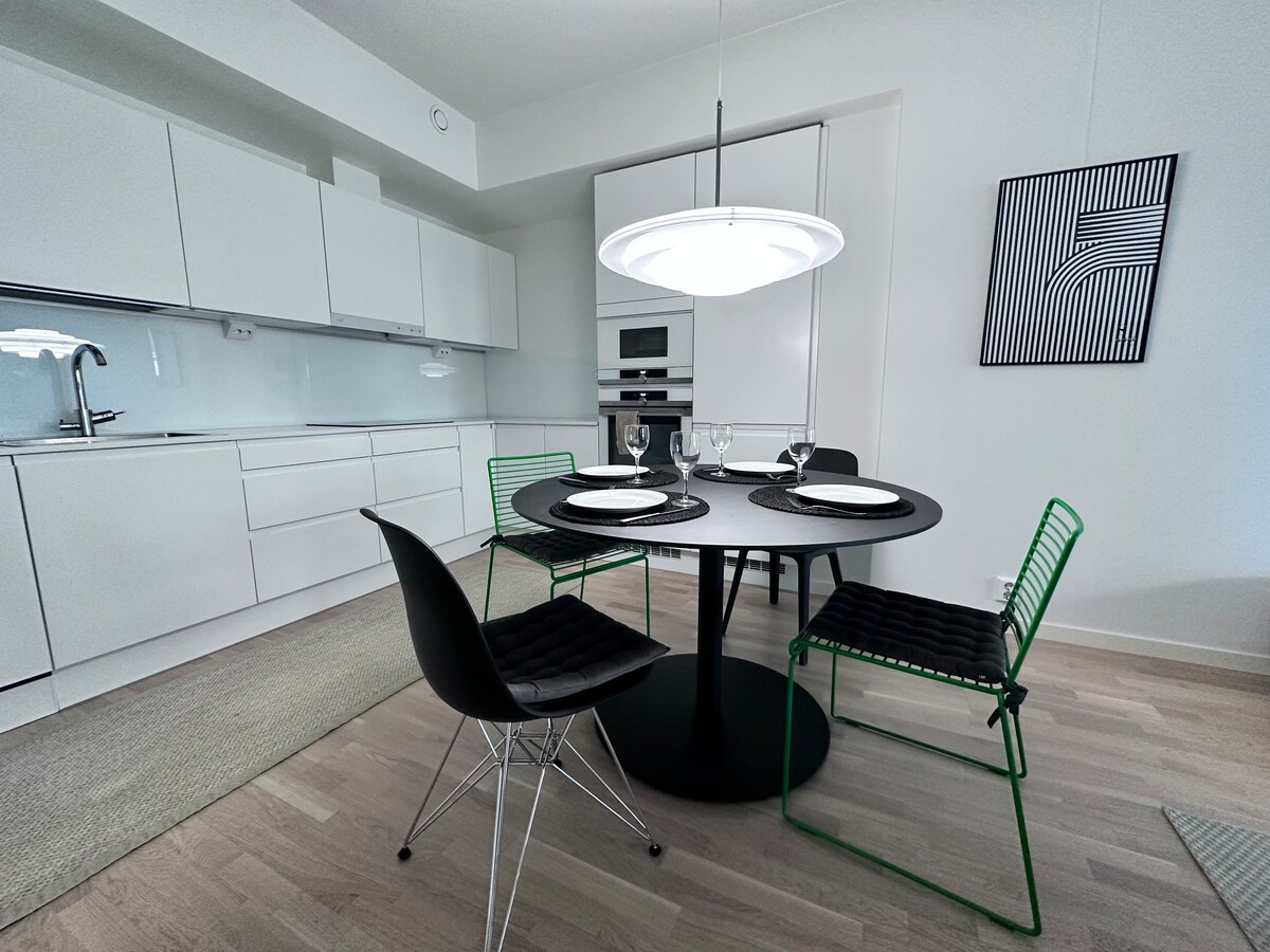 サービスの近くにあるこの静かでスタイリッシュなアパートでリラックスしてください。専用サウナを楽しみ、バルコニーで涼みましょう。デザインテーブルで料理をして食事をしましょう。シルクのように柔らかいフィンレイソンのユニシーツでぐっすりお休みください。別室の寝室には、布張りのヘッドボードと高品質の固定マットレスを備えたアメリカ製のベッドがあり、睡眠をサポートし、快適さを提供します。リビングルームには、Tapio Anttilaのソファベッドがあり、ダブルベッドまたはシングルベッドとして機能します。