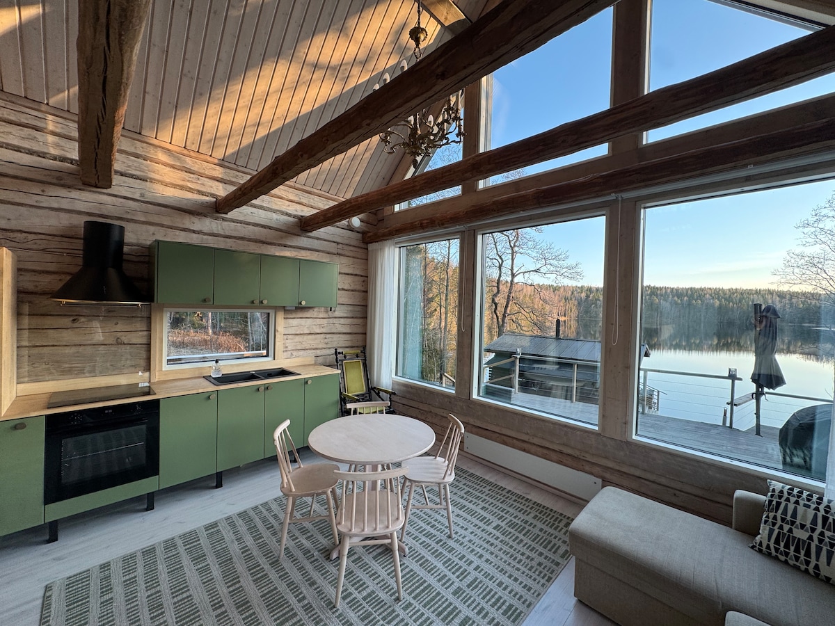 雰囲気のある丸太小屋70 m2、薪ストーブ式サウナ、シャワー、トイレ、ガスグリル、焚き火台、木製の納屋。 浅く、緩やかに深くなる砂浜。テリ・サイマンのボートとプリジョン・モーションのカヤック(1時間)をご利用いただけます。釣りが可能で、マス、シガ、パーチ、バスが釣れます。 コテージにはベッド6台(毛布と枕)、空気熱ポンプ、Wi-Fi、暖炉、水道、 冷蔵庫、電気コンロ、電子レンジ、コーヒーメーカー、食器。 リネンとタオルは料金に含まれていません。