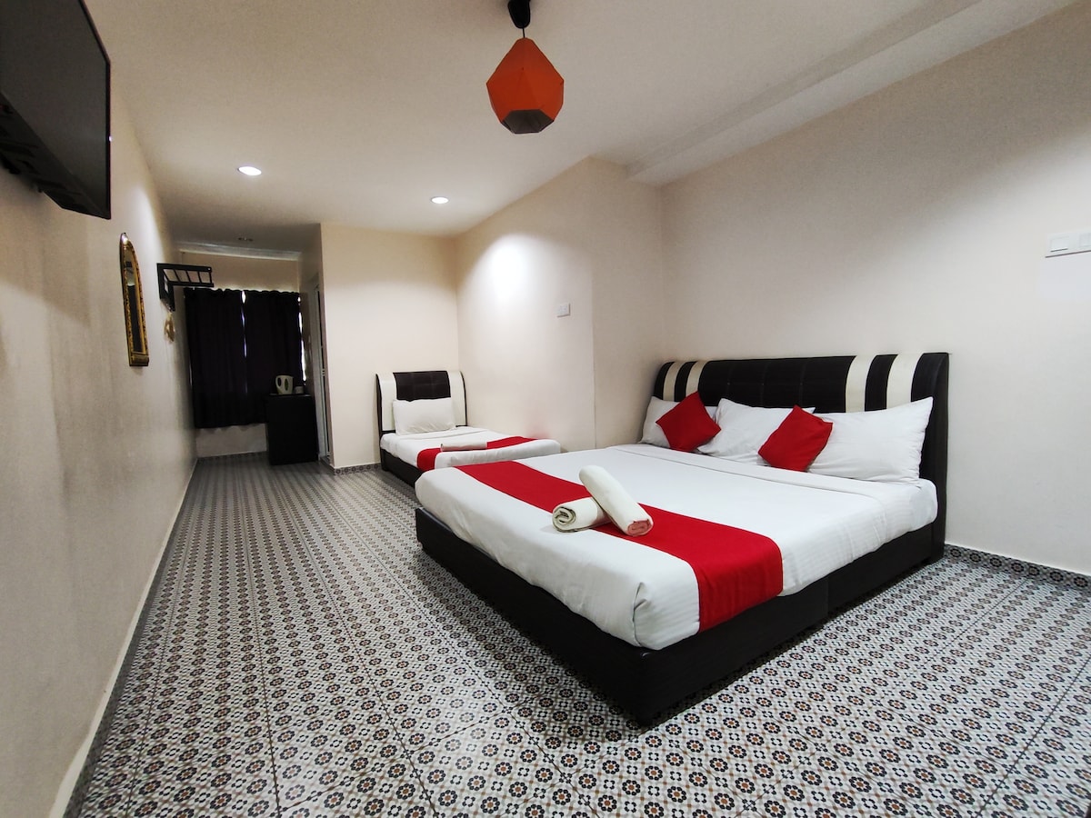 こちらの広々とした静かなお部屋で、日常の心配事を忘れましょう。 このトリプルルームは3名様(10歳以上のみ)が宿泊でき、専用のバスルーム(シャワー、お湯はすぐに出ます)が完備されています。 お部屋には、クイーンサイズベッド+シングルベッド、ハンガー付きワードローブ、ベッドサイドテーブル、天井ファン、無料Wi-Fiがあります。 **チェックイン時の稼働率によっては、別のフロアに予約が移動する場合があります。