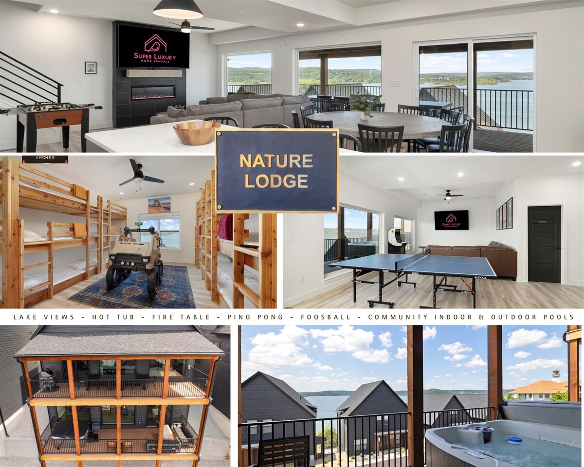 ネイチャーロッジは、ベッドで28名様がお休みいただけるように、あらゆる機会にお迎えし、楽しませ、喜ばせる準備が整っています。この家には湖の素晴らしい景色があり、ジャグジー、屋外ダイニング、ファイヤーテーブルで楽しむことができます。屋内には、85インチテレビ、Xbox、クラシックアーケードゲーム、ポップショット、フーズボールテーブル、卓球台が備わっています。7つの寝室は完璧に整理されています。5つの寝室にはキングサイズのThumaベッドがあり、2つの寝室には6人用と12人用の二段ベッドがあります。