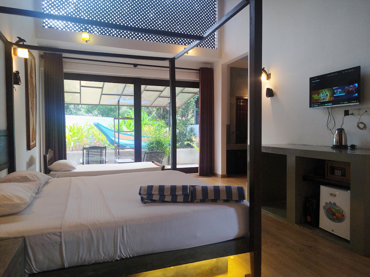 **リモートワーカー向けのファイバーインターネット接続を完備** スリランカ南部の緑豊かな環境にある、クイーンサイズベッドを備えた快適なワンルームです。 専用のバスルームと温水シャワー付きのエアコン。 タララビーチまで徒歩200m。海で泳ぐのに最適なスポットです。初心者にも優しいサーフィンを楽しむのに最適です。 無料Wi-Fiと敷地内駐車場。 タララビーチとその周辺エリアの魅力をすべて楽しむための拠点として最適な場所です。