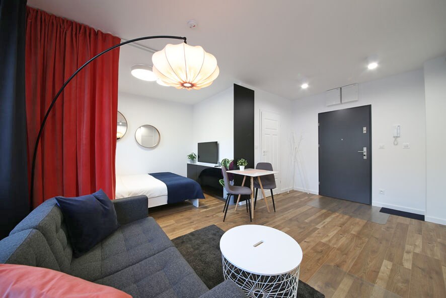 市内最大のショッピングモールの1つであるマグノリアパークの近く、レグニツカ通り59aにあるモダンなワンルームアパートメントです。アパートは、キッチン付きのリビングルーム、大きなベッド、ワードローブ、シャワーと洗濯機を備えたバスルームがあります。アパートにはテレビとインターネットが備わっています。利点は、建物への便利で拘束力のない入り口と、近くに無料駐車場があることです。