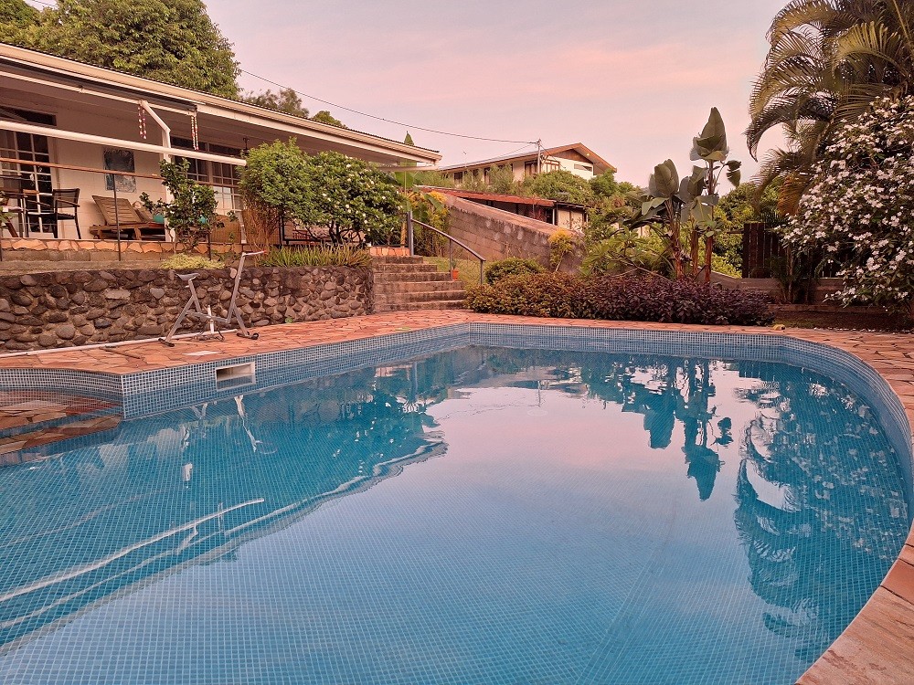 This beautiful home is located on a property with gorgeous views of Tahiti. Nestled at 1500ft on the presqu’île of Tahiti, you will be able to enjoy an amazing location in the country side of the island. Even though it is only a 4 min drive up a hill, the temperature is much cooler at this elevation. The house is completely screened in. The kitchen and living space open up to a huge deck overlooking the views of the beautiful mountains, the lagoon and reef.