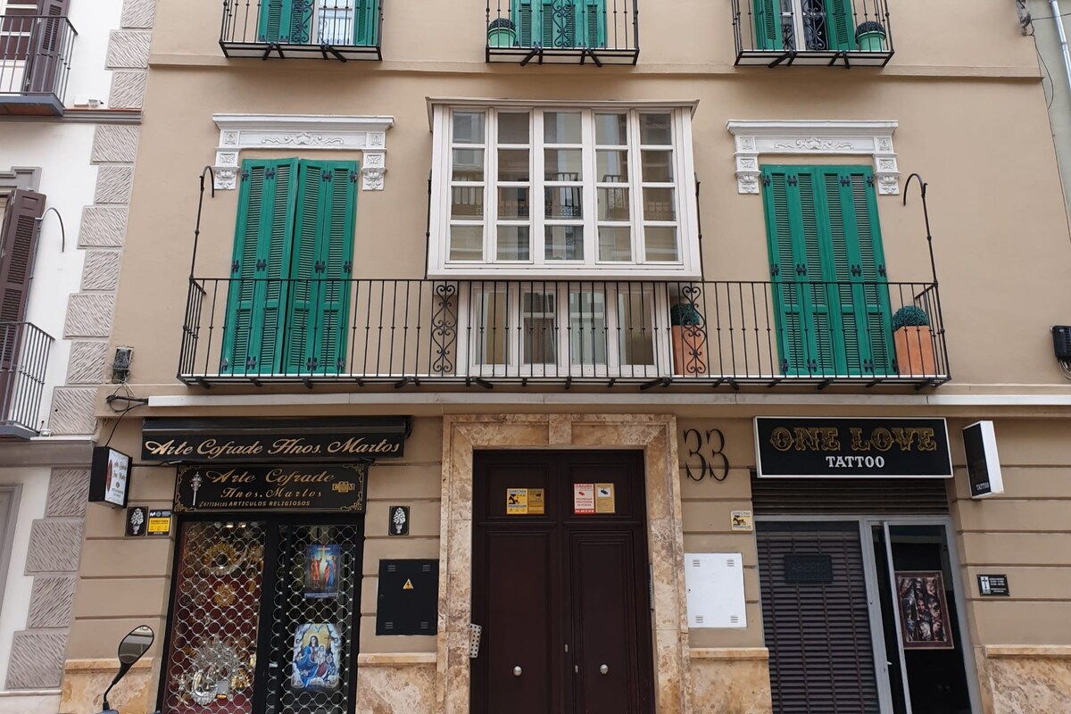聖週間の行列が見渡せる最高の眺望!マラガの中心部、改修された歴史的建造物の3階にある、明るくて立地の良いワンルームマンション。ビーチまで徒歩15分です。このワンルームマンションには、150 cm × 190 cmのベッド、設備の整ったキッチン、Wi-Fi、冷暖房付きエアコン、バスルーム、外に面した大きな窓があります。 カサパルマ通り、カルセル通り、ウンシバイ広場を通る聖週間の行列が見えます。