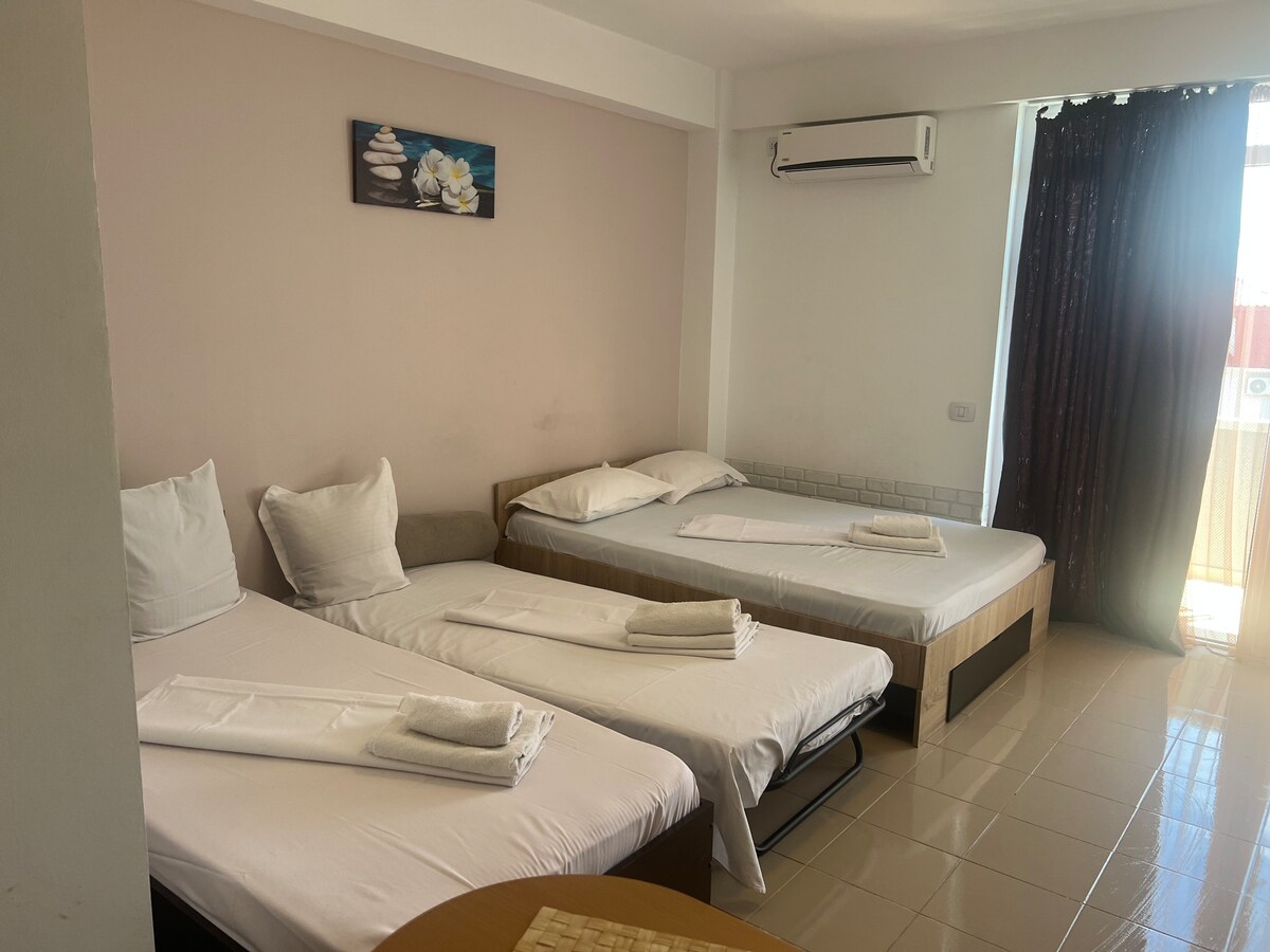 Enjoy the sea breeze in the wonderful waterfront apartment, with a spacious living room, a cozy bedroom, a full bathroom and a fully equipped kitchen. Drink your complimentary morning coffee on the balcony, watching the waves. Enjoy a lovely lunch with your family in the dinning area. Relax after dinner watching TV. Your seaside vacation will be a memorable one.