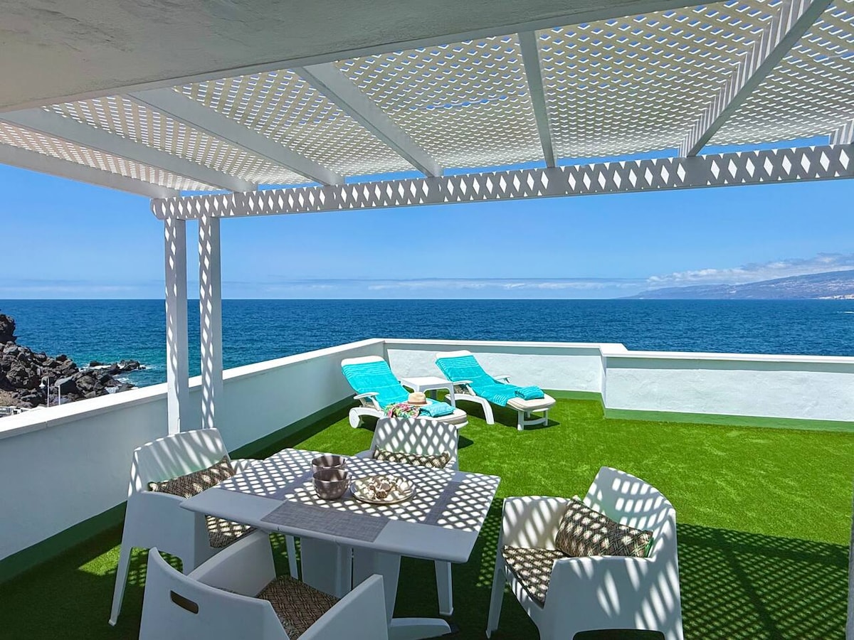 Frontline penthouse with wall-to-wall ocean views and nightly sunsets. Newly refurbished, air-conditioned, and designed for comfort: king bed with premium linens, rain shower, blackout blinds and an electric pergola. Cook in a fully equipped kitchen (dishwasher, oven, Nespresso), then relax by a large oceanfront pool with your own sunbeds. Fast fiber internet and an ocean-view workspace. Walk to Playa de la Arena and seafront restaurants. Free parking in front of enteance on the street.