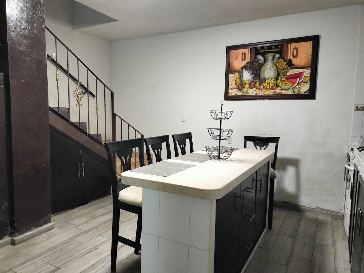 テピックの静かで安全な家:リビングルーム、ダイニングルーム、設備の整ったキッチン、フルバスルームを備えた2ベッドルームのこの家で快適な滞在をお楽しみください。庭(前と後ろ)でリラックスしたり、2台分の屋根付き駐車場をご利用いただけます。インスルヘンテス通りから1ブロック、スーパーマーケットや24時間営業の薬局の近くにあります。ガレージと通りに面した監視カメラによる追加のセキュリティ。家族やビジネス旅行者に最適です!