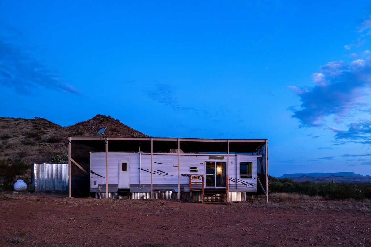 ALMA Ranch 1は、The Terlingua Ranch Lodge、Bad Rabbitt Cafe、プールから4マイル離れたTerlingua Ranchにあるユニークな宿泊施設です。 電気、空調/暖房、浄化槽システム(洗浄可能なトイレ)を備えた、家のような心地よさをお楽しみいただけるトレーラーです。 キッチンにはフルサイズの冷蔵庫、コンロ、電子レンジが完備されています。飲料水とコーヒーをご用意しております。 山に囲まれ、見渡す限りの景色を眺めることができる。夜空はすごい。永遠の星