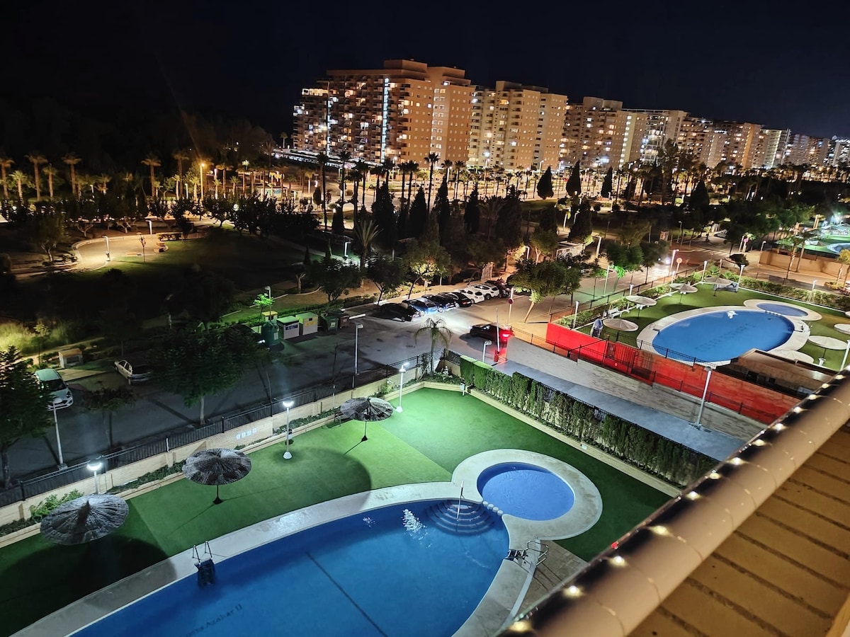 海を望む30mのテラスを備えたこの素敵なアパートで家族みんなでリラックスしましょう。複数の設備、プール、遊び場が都市内にあります。近くには子供と一緒に行けるレストランやアクティビティがたくさんあります。ウォーターパーク、週に3回の仮装パレード、屋外ジム、遊び場、レクリエーション施設...家族で楽しめる楽園です。アパートには2つの寝室と2人用の大きなソファーベッドがあります