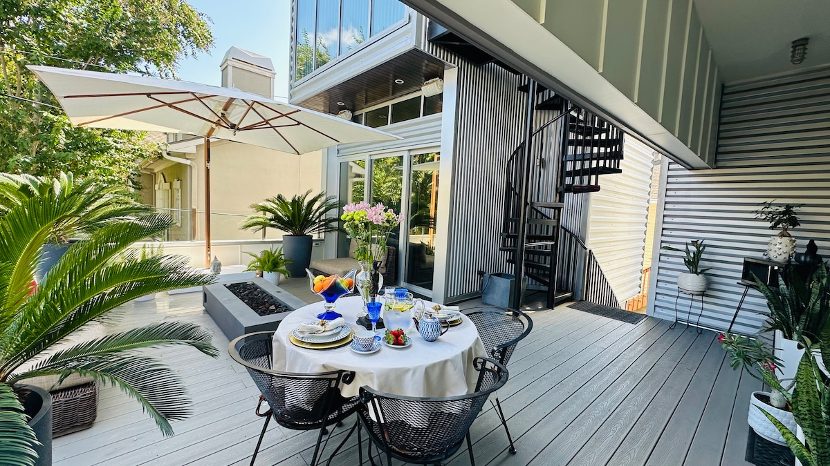屋外テーブルと椅子があるコンテナ型の宿泊施設