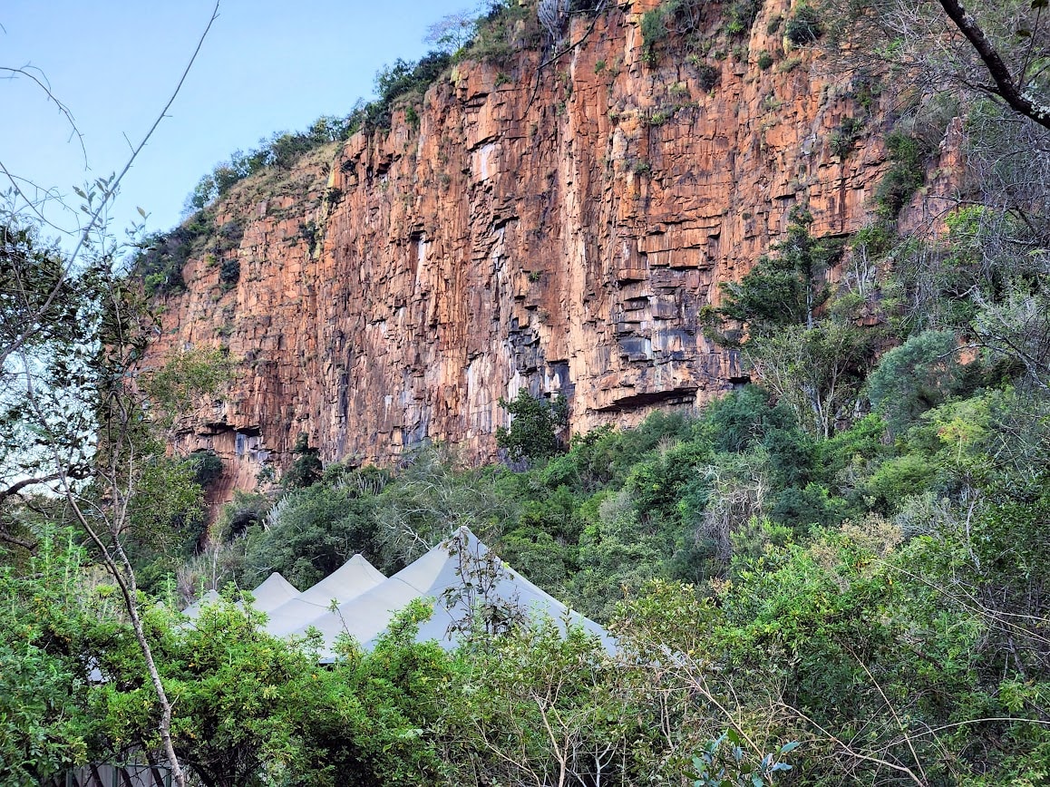 Luxury 2-Sleeper Tent with Pool: Our Aquila tent is uniquely located on a natural elevation in the escarpment, providing magnificent views of the surrounding cliffs, the crystal-clear pond in the mountain stream and the forested valley below. The plunge pool adjoining the deck overflows with pristine, natural earth water that streams out of a fountain on the high ground and is aerated by the waterfall while flowing down the ravine.