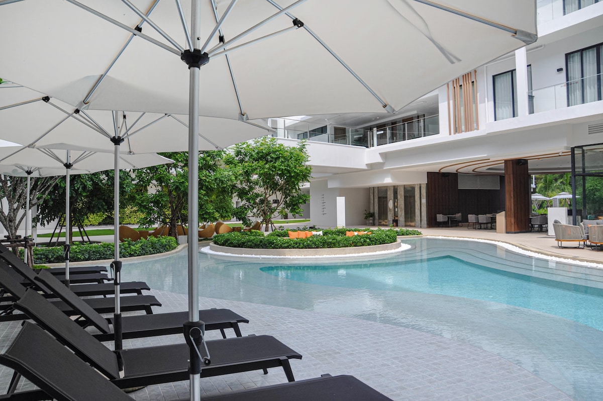 Stay at the brand new The Title development and discover ultimate comfort in this bright, pool-view apartment. Featuring curated natural materials, calming décor, and designer touches, the suite offers a tranquil escape overlooking lush gardens and shimmering lagoons. Sip your morning coffee on the private balcony and enjoy a restful night in the cloud-soft bedroom.