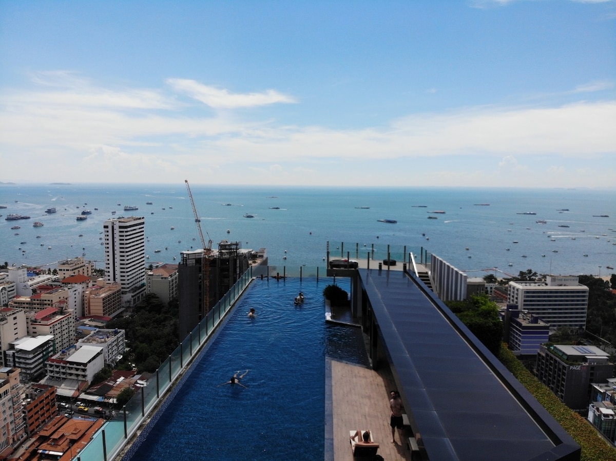 パタヤの高層階のオーシャンビュー2ベッドルーム、ベースのダウンタウン、インフィニティプール、ジム、すべてが揃っています