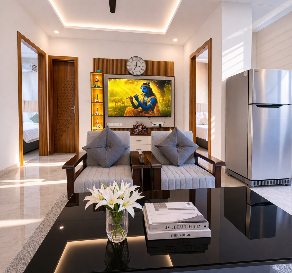Tucked away in the calm of Rishikesh, Solace by the Ganges is a warm and peaceful 2BHK home where you can truly slow down. Wake up to the soft rays of the sun, sip your morning tea as the mountains glow in the sunlight and let the gentle rhythm of nature ease your mind. It's a space made for quiet moments, soulful conversations and that feeling of being exactly where you're meant to be.