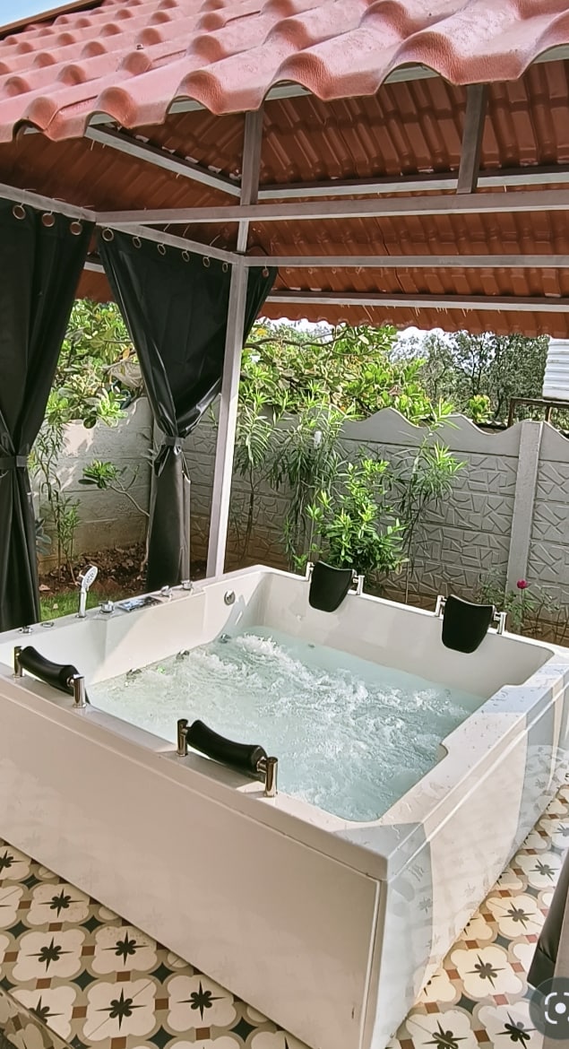 Boho Style Luxury Studio with Jacuzzi and Garden. A peaceful getaway. Fully loaded with WiFi, JBL 2.1 Home Theatre, BT Music System, Full-HD LED TV. A stylish bathroom with toiletries. Pantry with tea/coffee supplies, RO water, Microwave, Induction Hob, Fridge & s/w Toaster. Fenced garden for children. Dine in the garden with beautiful weather. Jacuzzi has hot water that can be used anytime. Common amenities on-site like swimming pool, games room, gym, mini theatre, cycling and restaurant.
