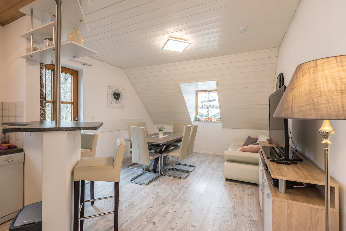 私たちは、快適な雰囲気の3.5ルームアパートメントを提供しております。これは、休暇用またはビジネスアパートメント(ホームオフィス)として適しています。広いキッチンとリビングルーム、バスルーム、約3つのベッドルーム 100平方メートルの2階建てのアパートで、最大5名様までご宿泊いただけます。小さなお子様1名様までご宿泊いただけます。南向きのバルコニーがあります。自炊用の設備の整ったモダンなキッチンがあります。玄関前に駐車場があります。