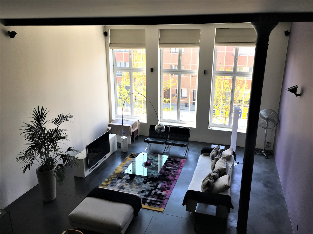 完全に修復された美しいインダストリアルロフト。私たちの家にあるロフトは完全にプライベートで、玄関ホールと裏庭は私たちと共有します。ロフトには、キッチン1室、幅1.8mのベッドがある広い寝室1室、リビングルームの景色が見える中二階があります。居心地の良い読書コーナーとイタリアンシャワーを備えた美しい新しいバスルームもあります。エアコン付きで合計65平方メートルです。ジャグジーのご利用は任意で、20ユーロでバスローブをご用意しております。