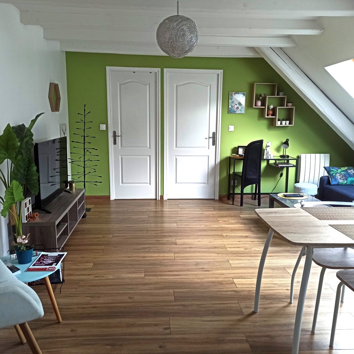 私たちのコテージF2は、家族の所有地の庭の端にあります。独立した別の入り口と専用の庭があります。隣には別のゲストハウスがあります。 50㎡の広さで、1〜4人まで宿泊可能です。ペット歓迎! 1.60mのダブルベッド1台とクローゼットを備えた寝室、ソファベッドを備えたリビングルーム、設備の整ったオープンキッチン、シャワーとトイレを備えたバスルームがあります。 薄型テレビと無料Wi-Fi。 駐車も簡単です。