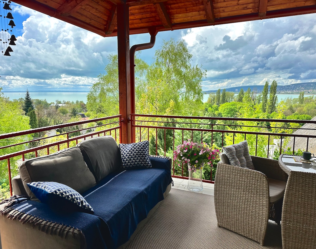 Kedélyes apartman családi házunk tetőterében. Két hálószoba, mindegyik külön fürdőszobával, előszoba konyhával és étkezővel és egy veranda kényelmes ülősarokkal áll vendégeink rendelkezésükre. A balkonról csodalatos panoráma nyílik a Tihanyi Belső Tóra és az őt körülvesző dombvidékre. Parkolóhely található a zárt udvaron. Vendégeink használhatják kertünket, grillezhetnek. Lakásunk NEMDOHÁNYZÓ, dohányozni a balkonon valamint a kertben lehet.