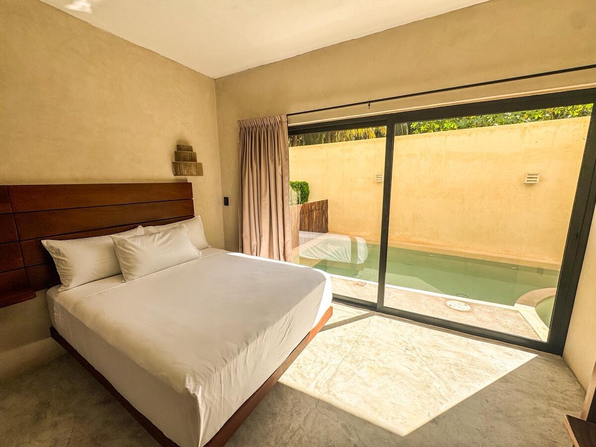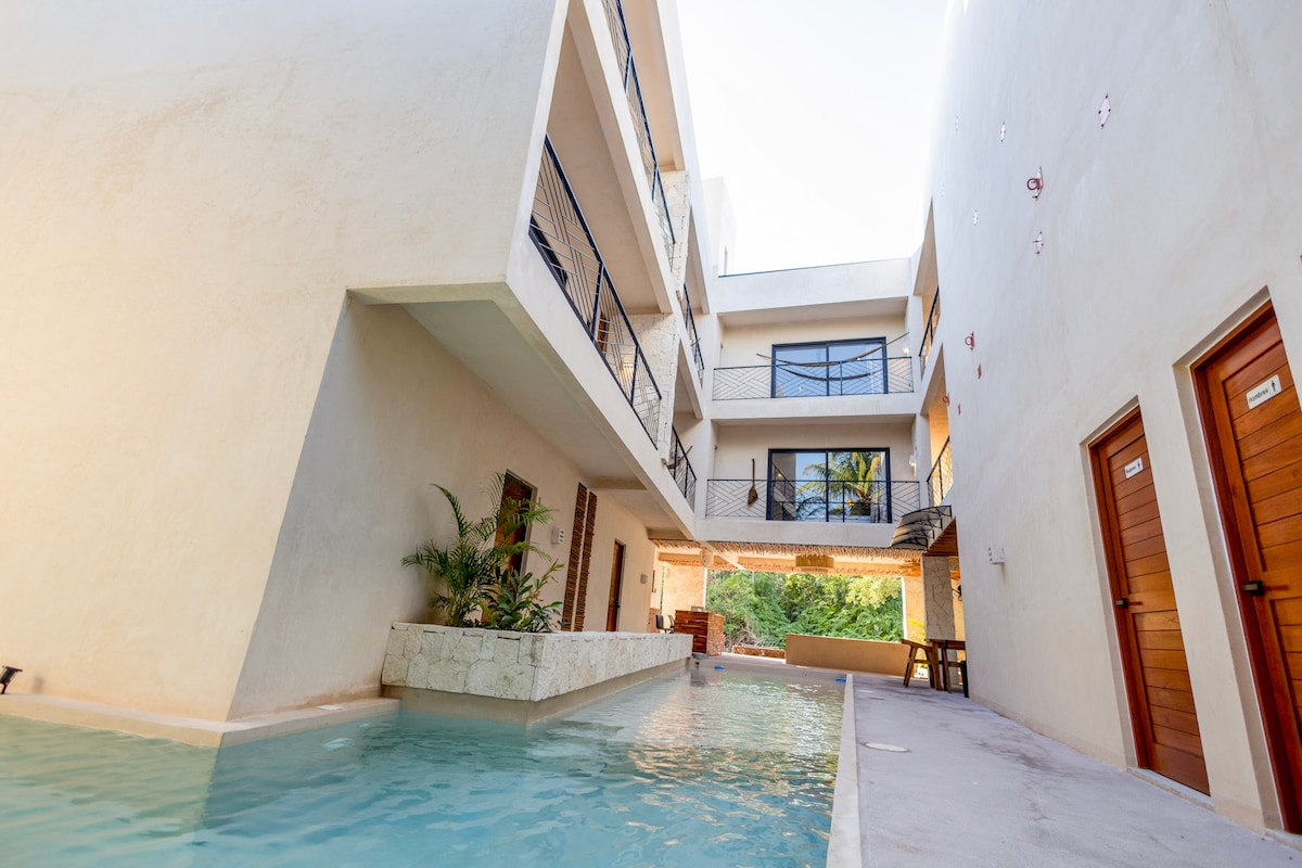 Amplia casa/habitación privada con capacidad para 9 personas (1 cama matrimonial, 5 individuales, espacio para colgar hasta 3 hamacas). Esta habitación cuenta con aire acondicionado, televisión y baño privado con agua caliente. Además de contar con una hermosa alberca compartida donde la cálida brisa fluye a través de los cocoteros. Disfruta del fácil acceso a tiendas y restaurantes populares desde este encantador lugar para hospedarte.