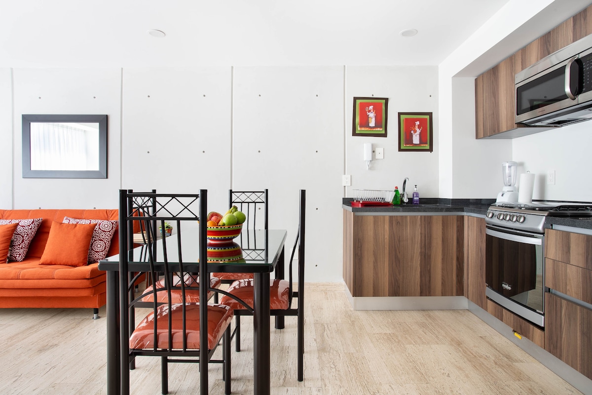 You’re about to discover your next stay! We’re thrilled to welcome you to our apartments. This building is not only in a prime location, but it also tells a story that celebrates contemporary Mexican art and culture. From handcrafted Talavera pieces made in Puebla to iconic quotes by renowned Mexican creatives like Octavio Paz and Alejandro González Iñárritu, every corner is designed to inspire you. Plus, you’ll get to enjoy one of the best views in the city.
