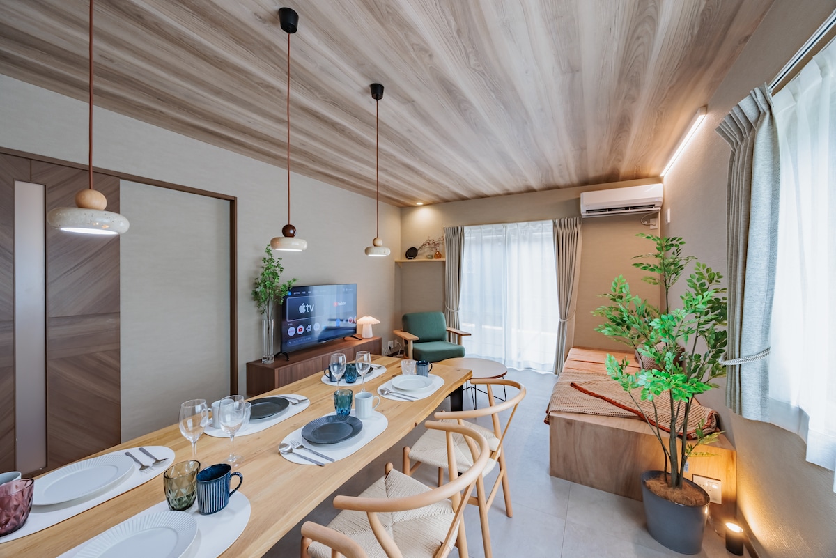 当施設は土岐プレミアムアウトレットまで車で6分、ジブリパークまで30分の立地にあります。 コンビニも徒歩5分の所にあり大変便利な場所です。 土岐市駅から車で8分となっております。 目の前には妻木川がゆったり流れ、その堤防は散歩コースになっております。 この宿泊施設は、以前当建設会社のモデルハウスでした。 築2年(2025年時点)と殆ど新築に近い住宅で、最新の設備と性能を備えております。 3年目を迎えるに当たってこれから住宅を考えられる方にも宿泊していただこうと考え、体験型宿泊施設としました。まだ誰も居住していない新しい住宅です。 その大きな特徴は断熱性能にあります。断熱等級5という高断熱住宅で、少ない冷暖房設備で快適に過ごしていただくことができます。 これから地元で同じような性能の住宅を検討されている方にも参考になるのではないかと思います。 また8人まで宿泊できますので同窓会や、パーティーにもお使いください。100インチスクリーンのプロジェクターも用意しております。是非家族や、気の合う友人とご利用下さい。