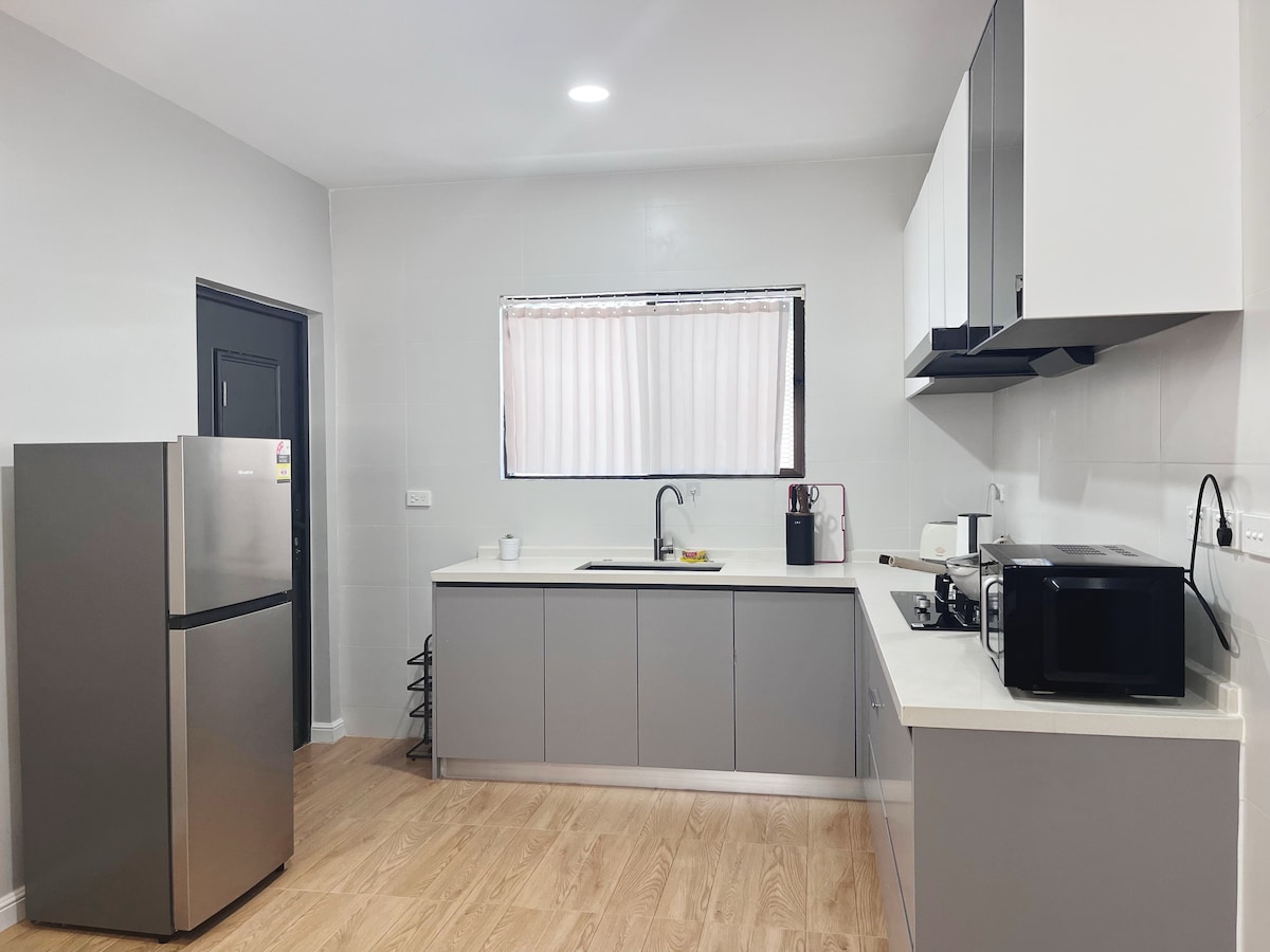 快適な滞在に必要なものがすべて揃ったモダンで快適な宿泊先です。このお部屋には、ソファとテレビを備えた明るいリビングエリア、冷蔵庫、コンロ、電子レンジを備えた設備の整ったキッチン、そして食事を共に楽しめるダイニングエリアがあります。エアコンで涼しく過ごせ、大きな窓からはたっぷり光が差し込みます。清潔でリラックスできる宿泊先をお探しのカップル、ひとり旅、少人数のグループに最適です。