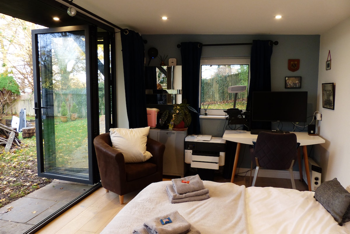 中心部にあるこちらの宿泊先はセブノークスの町へのアクセスに便利です。 モダンなワンルームキャビン。セルフチェックイン&チェックアウト。レジャーセンター、ノールパーク国民信託サイト、町の中心部まで徒歩5分。セブノークス駅まで徒歩10 ~ 15分。 この宿泊施設は、静かな住宅地の袋小路にあり、EV充電器付きの専用ゲート付きドライブウェイがあります。 ダブルベッド1台、専用シャワールーム付きのオフィスエリアがあります。 中心部に位置する落ち着いた宿泊先です。