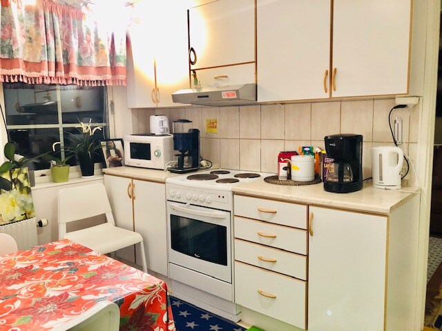 私たちの家の上の階にある、専用の入り口、非常に小さなシャワー/トイレを備えた居心地の良い(44m2)ワンルーム。写真に注意してください:階段を上ってください! ベッドリネンとタオルはAirbnbの料金に含まれており、キッチンには基本的なものが備わっています。 中心部までの距離が短い。庭に駐車スペースがあります。キッチン、玄関、小さなシャワー/トイレ、リビングルームにはテレビ、ソファベッド、ダブルベッド、アームチェアがあります。 大人2人、または大人2人と子供2人などのグループの場合は4人に最適です。