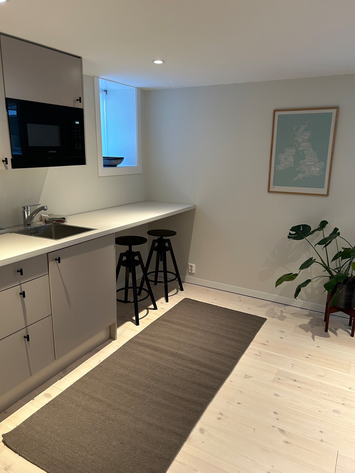 Lys og trivelig 1-roms leilighet med kjøkkenkrok. Inneholder dobbeltseng og sovesofa. Kjøkkenet har kjøleskap/fryseskap, koketopp, stekeovn, mikrobølgeovn og oppvaskmaskin. Stort og lyst flislagt bad med gulvvarme. Inneholder toalett, servant og dusjhjørne. Leiligheten ligger i garasjebygg på bakkeplan. Egen terrasse med sol på ettermiddagen. Det finnes også mulighet for å leie en grillhytte som finnes på eiendommen. Har 2 sykler som er mulig å leie (5EUR per dag) Gode parkeringsmuligheter.