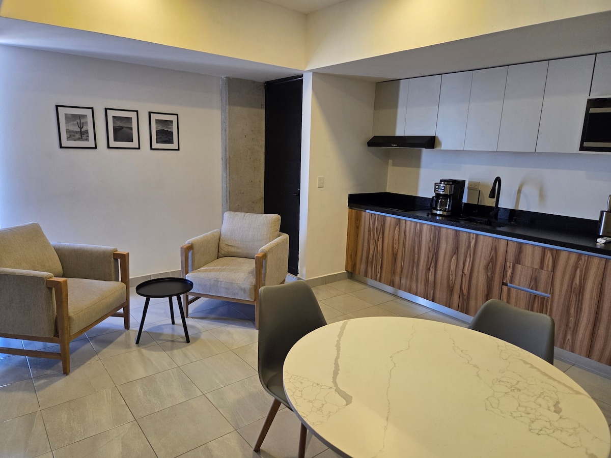 このエレガントで新しく広々とした宿泊施設は、 住宅地のIMSS 16と71。 キッチン、バスルーム、冷暖房用のミニスプリットを含む設備が整っています。 すべてのサービスが含まれており、すべてが新しく装備されたランドリーと居心地の良いテラスがあります。 清潔さが最も重要です
