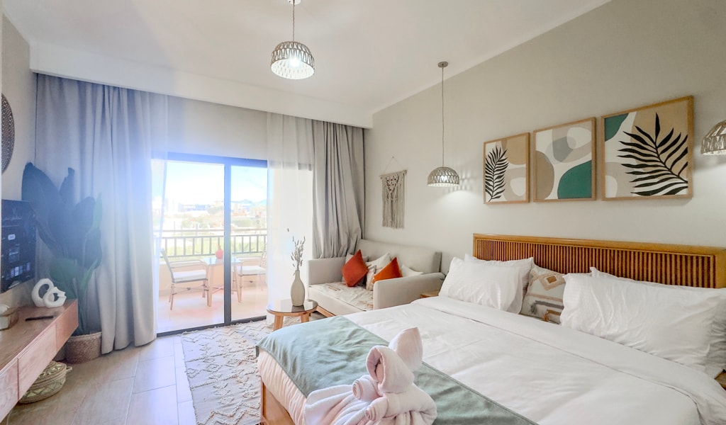 紅海からわずか数歩のハルガダのスタイリッシュなワンルームへようこそ! 明るいワンルームには、開放的なリビングスペース、快適な寝室/リビングエリア、設備の整ったミニキッチンがあり、モダンな快適さを提供します。 ヤシの木や花に囲まれた専用バルコニーとプールエリアをお楽しみください。 無料Wi - Fi、エアコン、プールへのアクセスなどのアメニティ・設備を備えたこのワンルームは、海辺での滞在に理想的なリトリートを提供します。