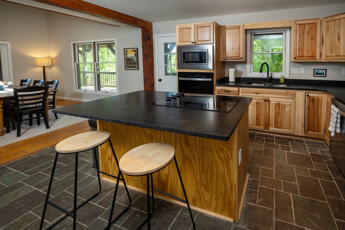 Big Sky Lodge sits on 3.3 acres with 360 degree views of the mountains and woods. It is a brand new build with lots of quiet places to relax. We’ve paid attention to design details with plush beds, double oven, high end fireplace, custom cabinets, large deck, stamped patios and fire pit. The kitchen is loaded with nice pots and pans and pottery baking dishes. Every bedroom has a television as do both living rooms. The top of the property is locally considered one of the best views in Townsend.