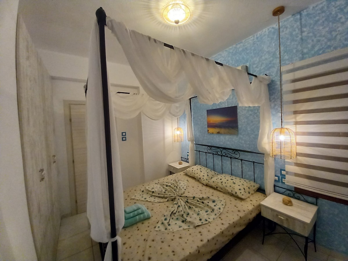メガリ・アンモスのビーチにある小さな(32平方メートル)夏のファミリーハウスです。 目覚めたら海に飛び込み、波の音を聞きながら眠りましょう。 ザクロとヤシの木陰で昼食や夕食を楽しめる屋外シーティングエリア。 テラスにはリラックスできるサンベッドがあり、ビーチに持ち運ぶこともできます。 ビーチの近くに素敵なカフェやレストランがあります。 シーハウスは隣の家とテラスを共有していることをご了承ください。