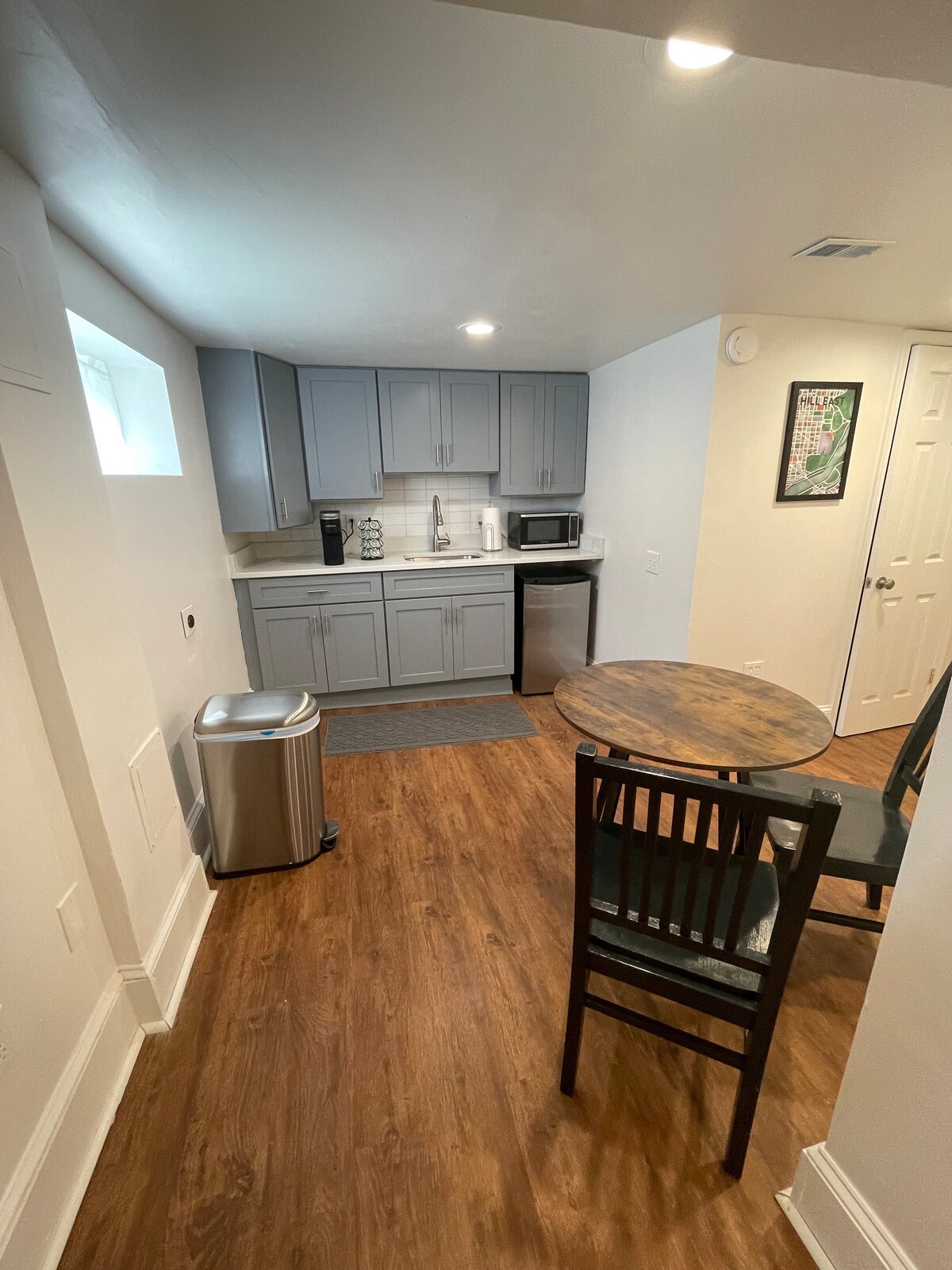 This quiet carriage house is nestled in one of DC’s prettiest neighborhoods. It’s within walking distance to the Capitol dome, the Supreme Court, Libraries of Congress, the Eastern Market metro station, restaurants, coffee shops, bars, and more. It’s a clean, modern, climate controlled studio apartment with a queen sized bed, efficiency style kitchenette, washer and dryer, and bathroom. It has its own entrance, separated from the main house by a courtyard.