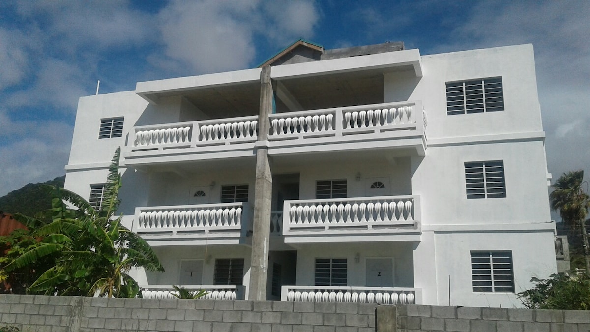 Juste Paradise Estates (JPE)はロス大学の向かいに位置し、北は美しい山々、南はカリブ海が見えます。アパート2号室は広々とした1ベッドルームで、専用キッチン、リビングルーム、バスルームシャワー、ランドリーエリア、バルコニーがあります。