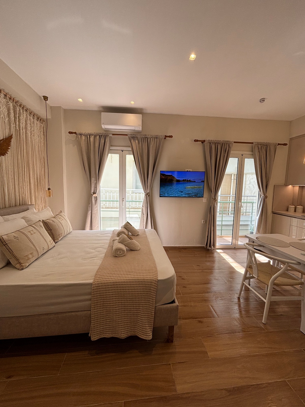 白いトーンとボーホーのアクセントが融合した新しくデザインされたアパートで、快適さと静けさを体験してください。設備の整ったキッチン、ダブルベッドに変わるソファベッドを備えたオープンプランのリビングエリア、大きなダブルベッドを備えた広々とした寝室を備えています。エレベーター付きの1階にあり、移動が簡単です。広々としたバルコニーからはビーチが見渡せ、海の景色と穏やかな波の音が聞こえ、竹製のブランコチェアで究極のリラクゼーションを味わえます。