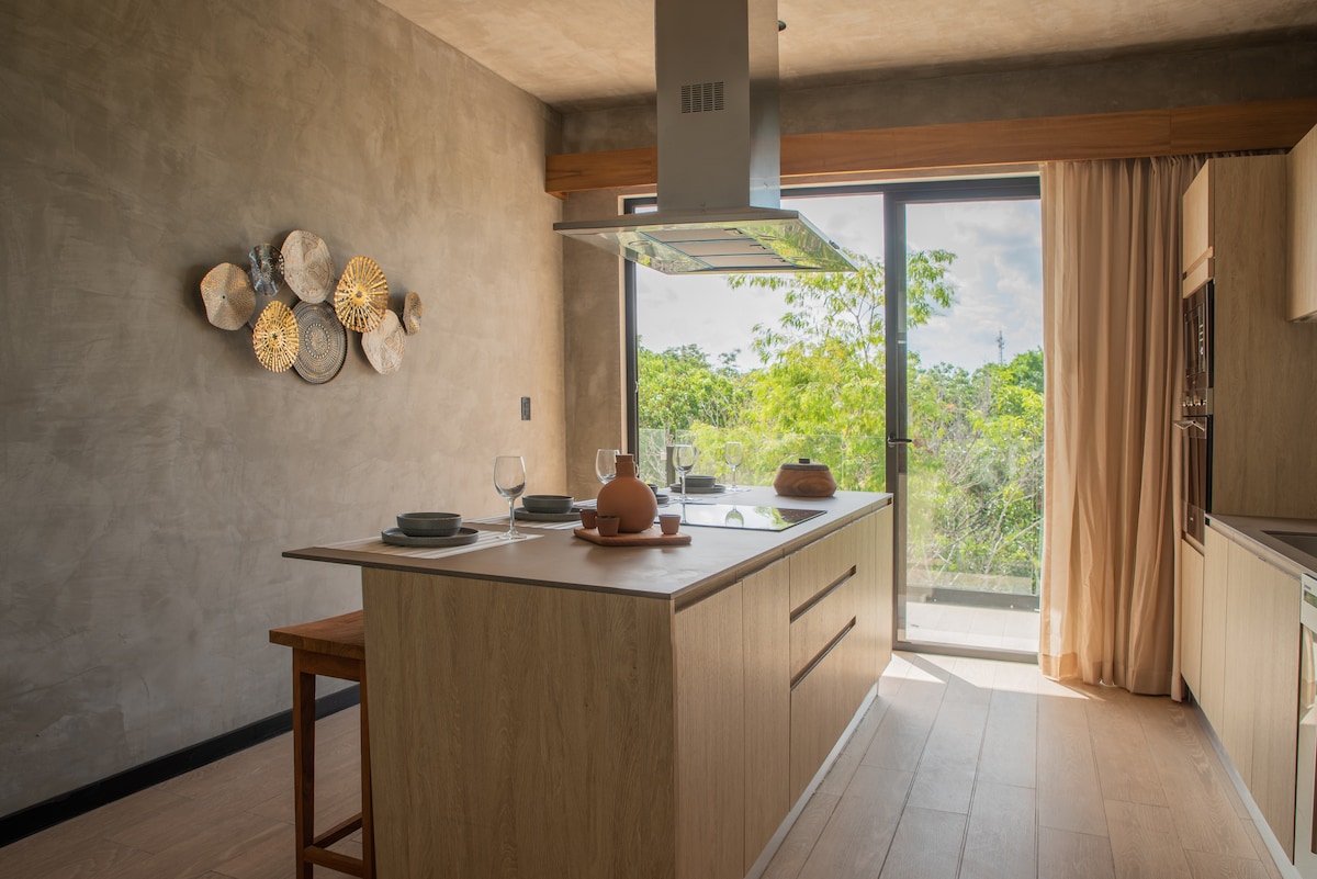プライベートガーデンにジャグジーを備えた、木材と照明が完璧な雰囲気を作り出す、エキゾチックな植物がある、壮大なアパートであるtuluminatiの世界に完全に浸りましょう。さらに、2つのベッドルーム、リビングルーム、ダイニングルーム、設備の整ったキッチンがあり、5名様が快適にご宿泊いただけます。プールは玄関からわずか3歩のところにあり、カリブ海とメキシコのジャングルにインスパイアされた最高のデザインと装飾が施されており、100%ボーホーシックな静かで快適な休暇に最適です。