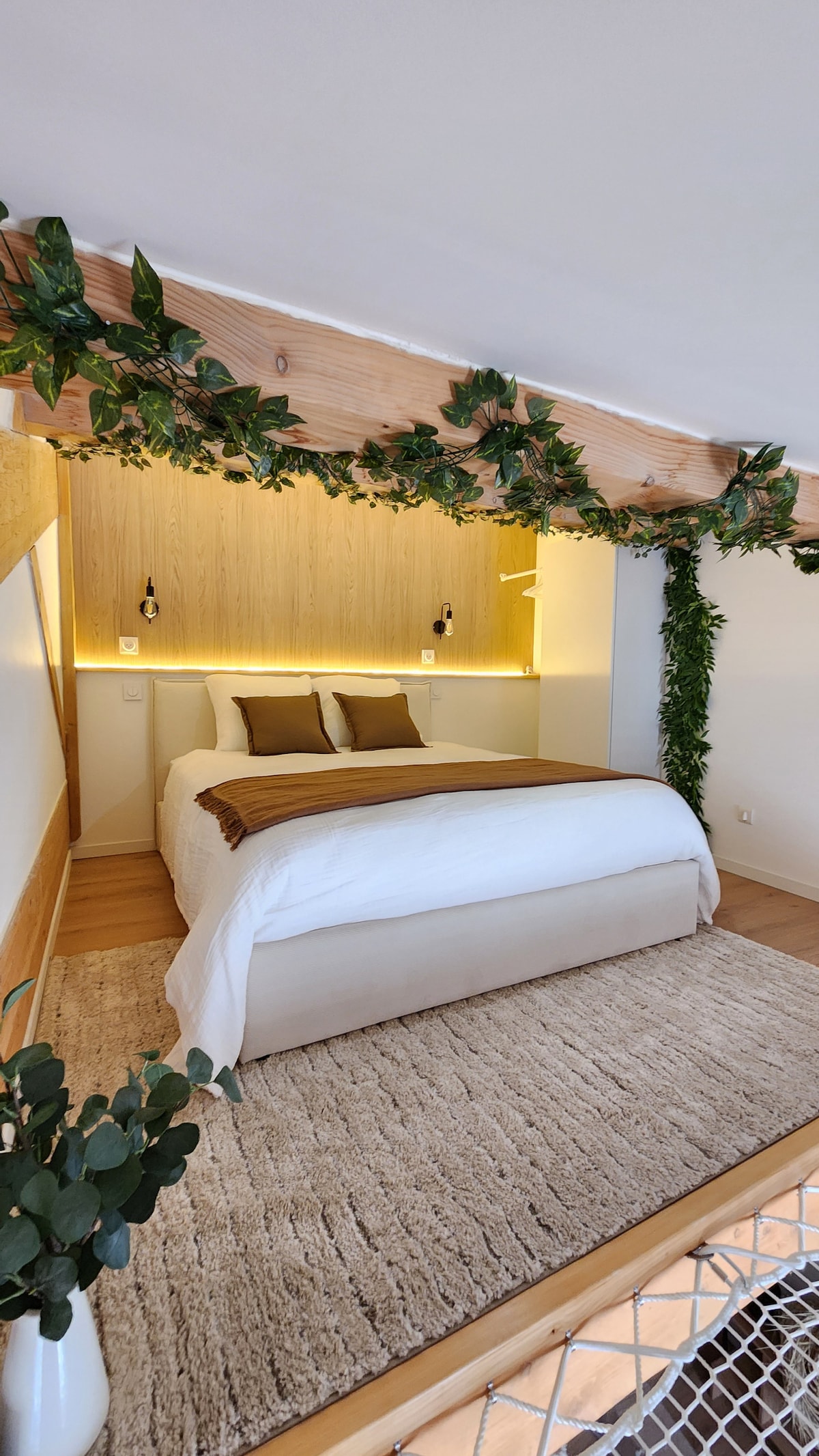 ロッジは、最高級のサービスを提供する屋上ペントハウスアパートメントです。最大3名様までお泊まりいただける60平方メートルのお部屋です(3人目のお客様用の寝具は、Maison du Monde製の1人用ソファベッドです)。La Logeは、快適さと伝統が完璧に融合した空間です。裸骨造りの天井、エアコン、光ファイバー接続と豊富なテレビチャンネル、設備の整ったキッチン、厳選されたインテリア、美術作品の展示、テラス、バルコニー、有料の専用駐車場を備えています。