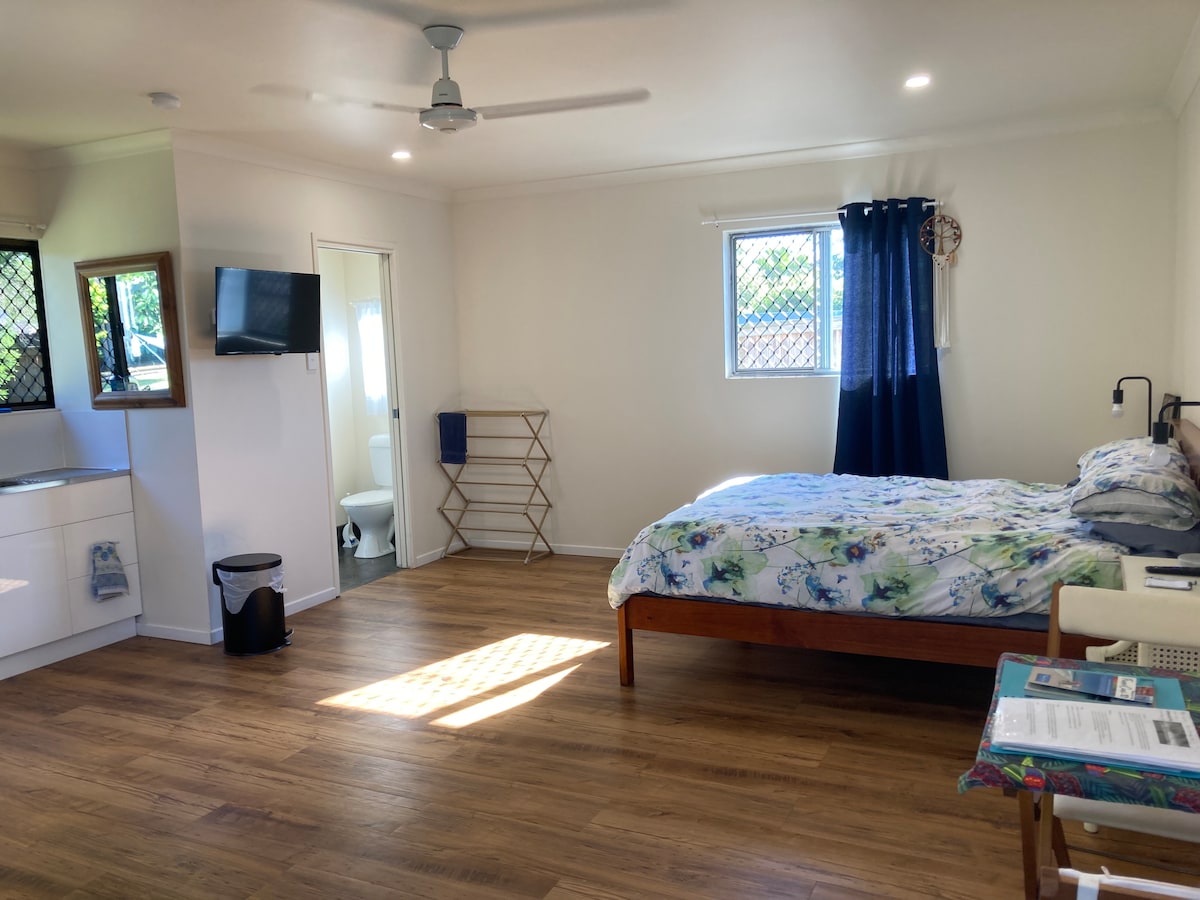私たちのスタジオへようこそ 😊 トイレ/シャワー、お茶/コーヒーポッドメーカー、基本的な朝食をご利用いただけます。電子レンジ、ホットプレート、鍋、フライパン、冷蔵庫、トースターなどの簡易キッチンもご用意しています。 エアコンを新しく設置しました。美しいハービーベイビーチまで車でわずか5分または徒歩15分、ショッピングやコンビニまで徒歩5分の場所にある、自分だけの平和なオアシスをお楽しみください。自転車を借りることができ、どんなリクエストにも対応できます。