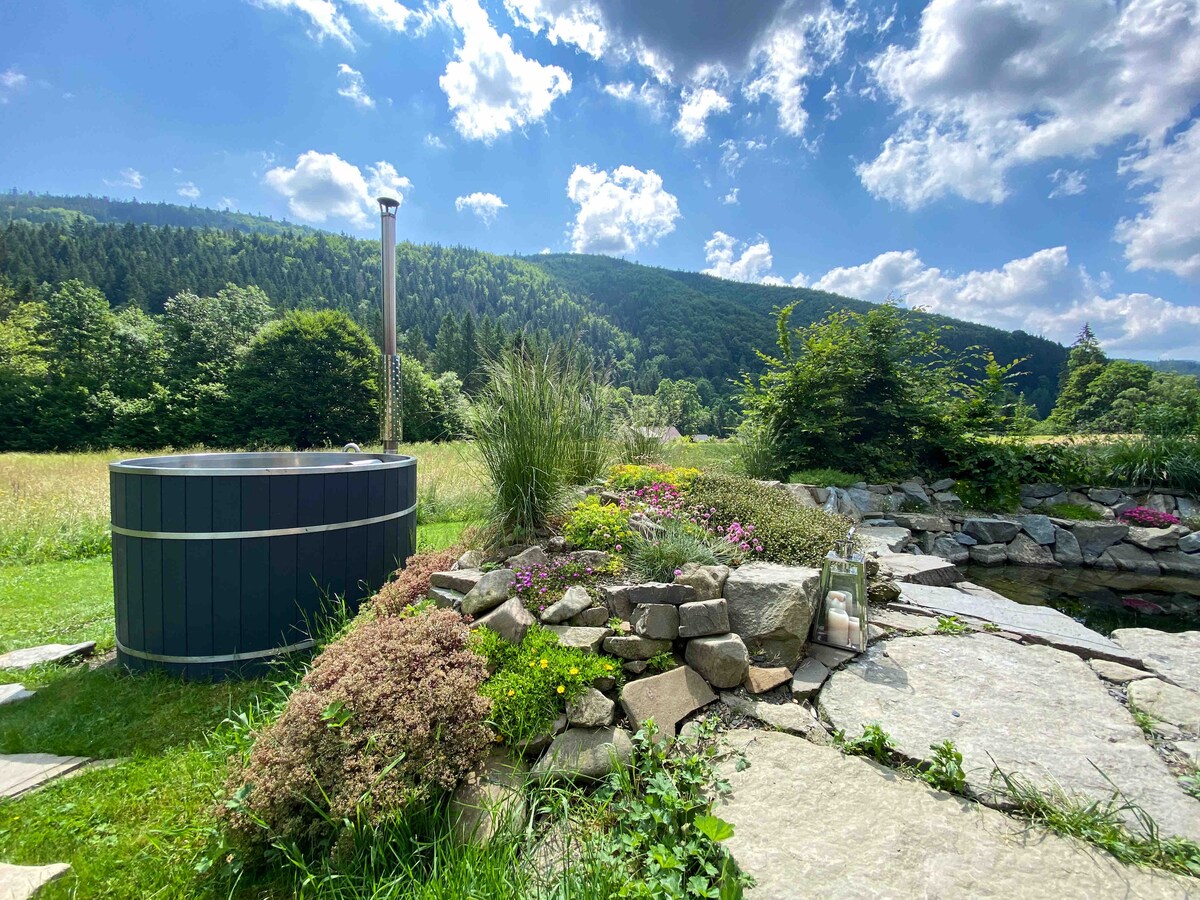 森の景色を望む屋外ガラス張りのサウナと、リラックスできるジャグジーを備えた美しい木造の家にご招待します。(注:冬の霜の場合、ジャグジーを一時的に使用できなくする場合があります)。家には3つの寝室、設備の整ったキッチン、2つのバスルームがあります。冬には、近くに2つの素晴らしいスキー場、ザグロンとズウォティ・グロンがあります。そして、45分の距離に、シュチレックの素晴らしいスキーリゾートがあります。 重要: 冬は安全のためにチェーンを持ってくることをお勧めします。