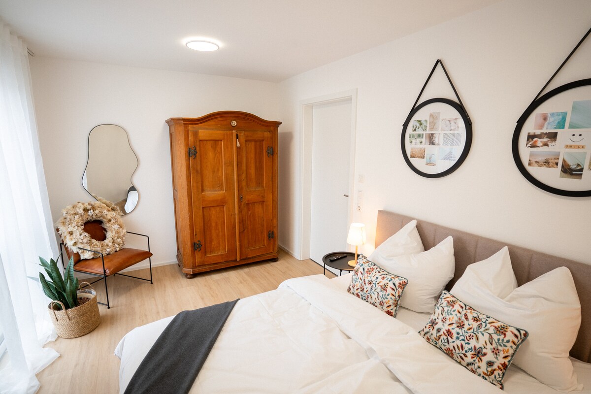 The bedroom is furnished with a high-quality, very comfortable box spring bed, a large wardrobe and its own TV. The living room invites you to relax with it's chaise lounge and beanbag. TV, Wi-Fi, Google Chromecast and DVDs are available. The kitchen is fully equipped, including a coffee machine, blender, microwave and dishwasher. The daylight bathroom features a walk-in shower. The apartment is on the ground floor with its own entrance and a parking space directly in front of the door.