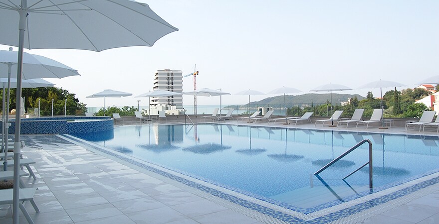 Genießen Sie einen atemberaubenden Urlaub mit Pool, Saunalandschaft, Fitnessstudio und Blick über die Bucht von Bečiči: Nur wenige Gehminuten vom Strand entfernt, bietet unsere komfortable, stilvolle und saubere Zwei-Zimmer-Wohnung in der 2021 neu eröffneten Ferienanlage nicht nur ein wunderschönes Panorama, sondern auch Ausblick auf eine unvergessliche Zeit in Budva.