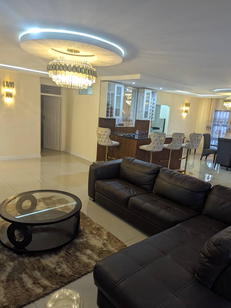 Have fun at this stylish quiet place where every flutter tells a story. Enjoy open plan living area with a bar, dinning area, fully equipped kitchen, modern light-filled space designed for your comfort and relaxation blending with uninterrupted power with a full backup solar system, uncapped WiFi and secure double parking. All three bedrooms have ample cupboard space, a desk and an en-suite bathroom.