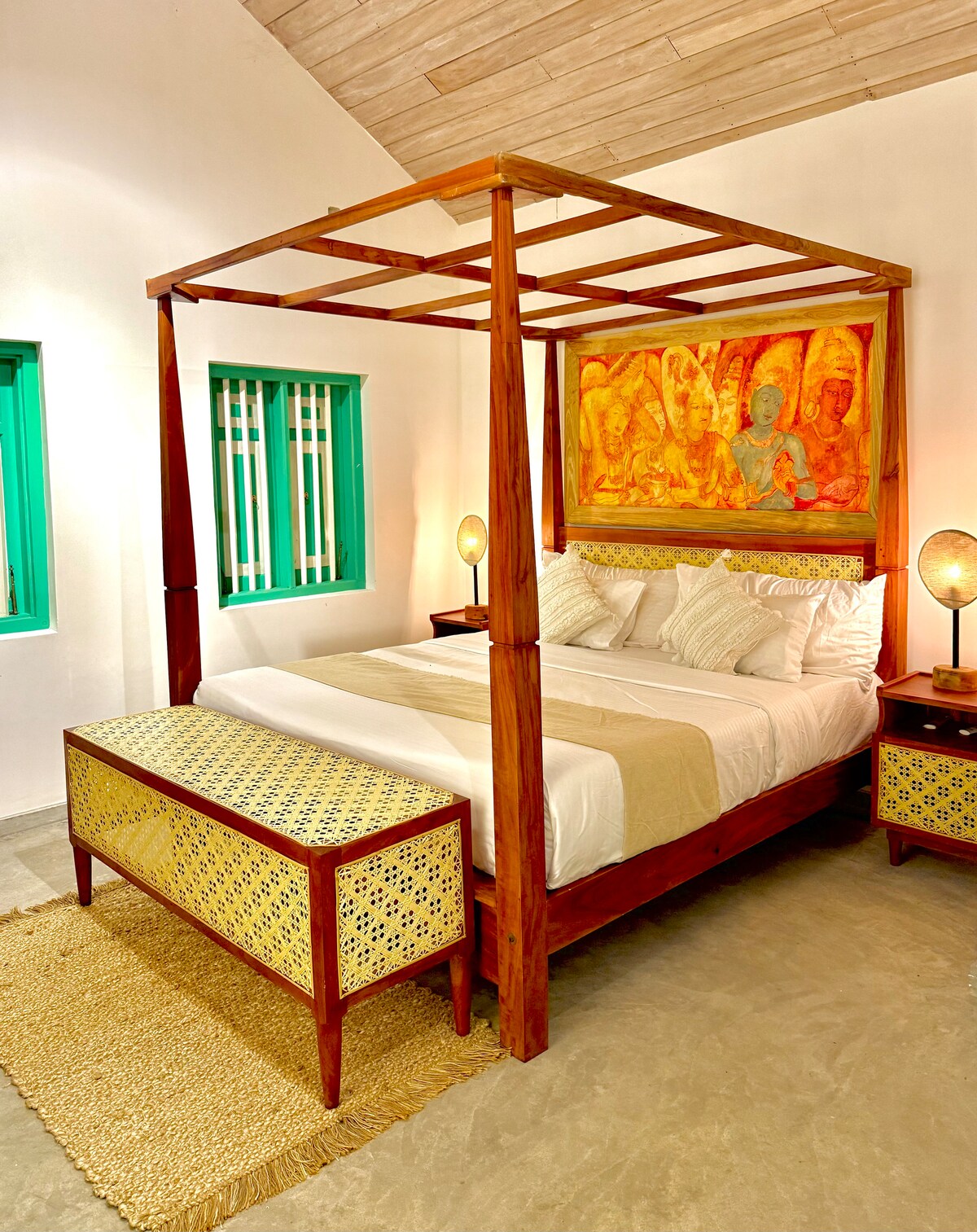 This stylish and unique place sets the stage for a memorable trip. This room has attached tropical indoor bath tub and shower too. The room has huge bed with comfortable mattress. All the furniture has unique designed of modern rattan. This room has Kandy kingdom style two paintings and beautifully decorated table lamps and floor carpets too. More than the room our property has huge garden, free car parking, dining and kitchen, veranda and huge living room too.