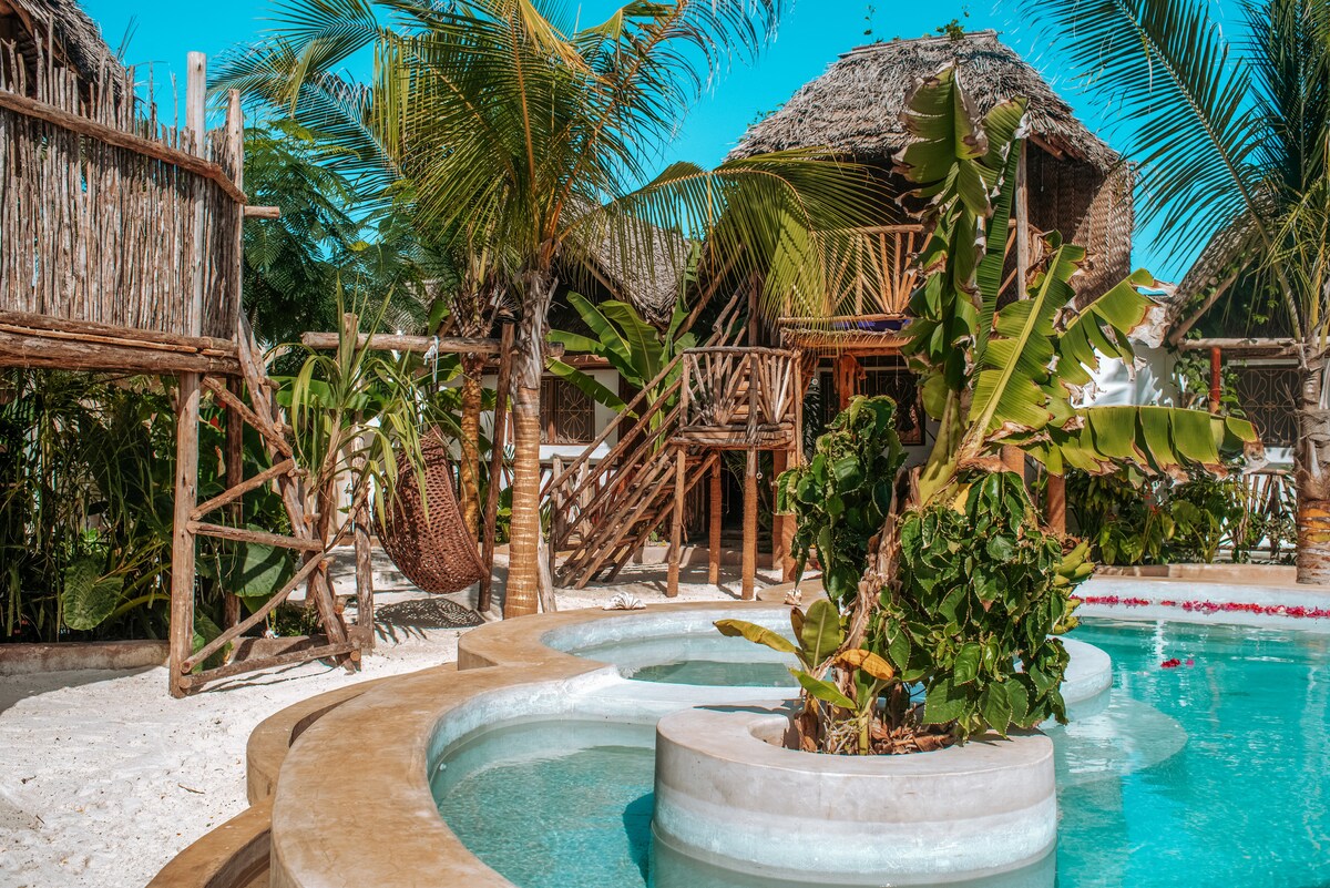 The suite is a part of 8 rooms Gaia Villas hotel in Nungwi. Nestled in a tropical paradise, our stylish accommodations are a perfect blend of comfort and charm. We invite you to slow down and experience Zanzibar ‘Hakuna Matata’ and ‘Pole pole’ life. Unwind by our beautiful swimming pool and enjoy our lush tropical garden. At our hotel, we treat everyone like family, ensuring that all guests enjoy their stay to the fullest. We're located 650m from the beach (~7 mins walk).