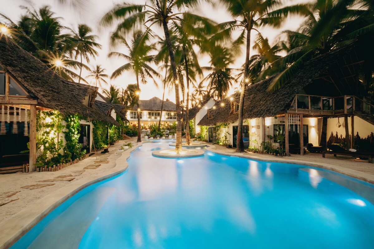 Jambiani Whitesands Bungalowsは、ザンジバルの手つかずの自然が残る東海岸にあります。快適なバンガローは伝統的なスワヒリのデザインとモダンな快適さを備えており、それぞれにターコイズブルーの海を見下ろす専用テラスがあります。レストランで美味しい地元料理と国際的な料理をお楽しみいただけます。シュノーケリングやダイビングを通じて活気に満ちたサンゴ礁を探索してください。ガイド付きの村ツアーで地元の文化に触れ、美しいビーチでリラックスしましょう。